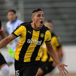 Jonathan Sandoval en el grito de gol de Peñarol en la Villa.