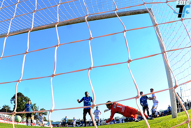 Santiago Romero ya sacó el zurdazo, Rodrigo Rodríguez vencido y la pelota camino a la red negriazul.