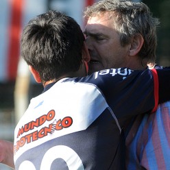 Mario Saralegui se abraza con Aldo Díaz en el final del partido.