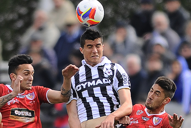 Maxi Perg observa a Santiago Bellini en lo alto cabeceando el balón y a Andrés Schettino a su lado.