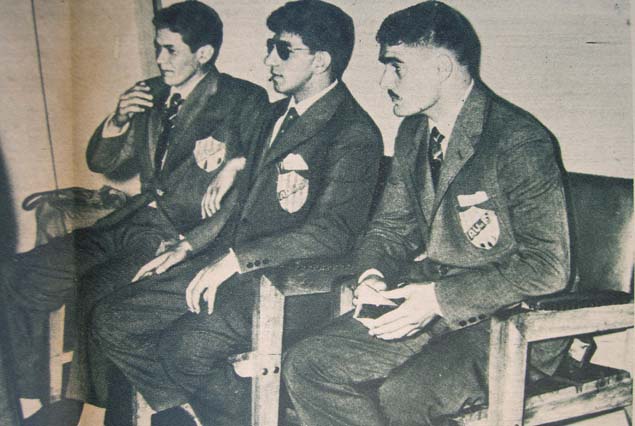 La fotografía es de 1957. En el aeropuerto, para partir al Sudamericano de Lima, el joven José Sacía esta en el medio con lentes negros. A su derecha Edgardo González y a la izquierda el “Gallego” Taibo. Lucen el traje de la Asociación con el escudo de la AUF.