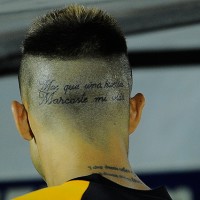 Tatuaje… Mathías Saavedra, futbolista de Sud América y un tatuaje en homenaje a su padre. En la nuca, en dos líneas se grabó la inscripción: “Más que una huella Marcaste mi vida”.