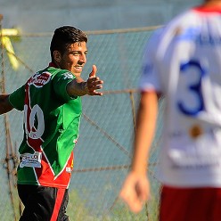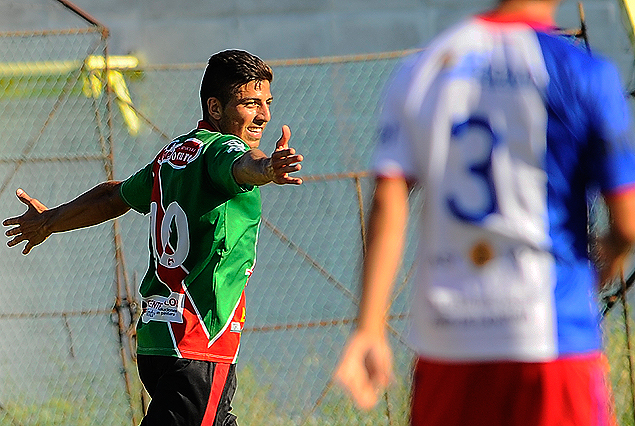 Giovanni Zarfino, autor de un doblete, festeja el primer gol de su cosecha. Boston River venció 3:1 a Huracán.