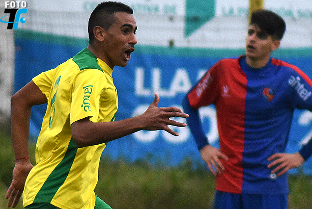 Wanderson Silveira en el festejo del segundo gol de Cerrito, lo sufre Lucas Ruiz (Albion).