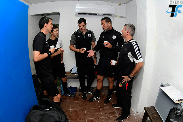 Javier Bentancor junto a sus compañeros de la cuaterna arbitral, Robert Muniz, Matías Rodríguez, Hernán Heras y el fisioterapeuta Marcelo Costa en el vestuario del Estadio José Nasazzi.