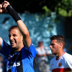 Emiliano Alfaro y un festejo que ya no estará en Primera.