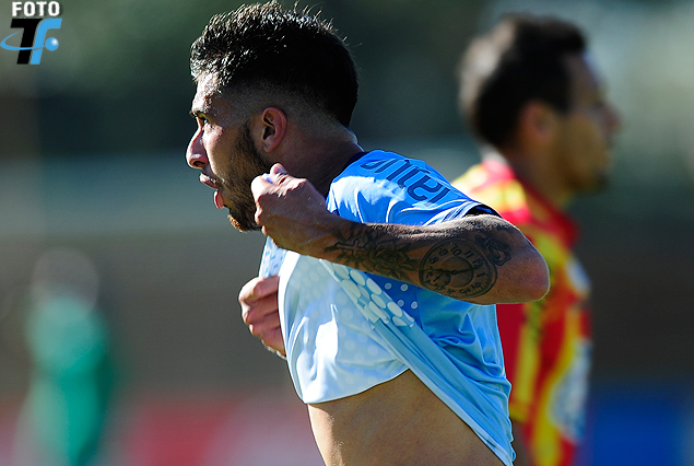 Leonardo Pais en el festejo de gol de la apertura para Torque. Lo sufre atrás Javier Méndez.