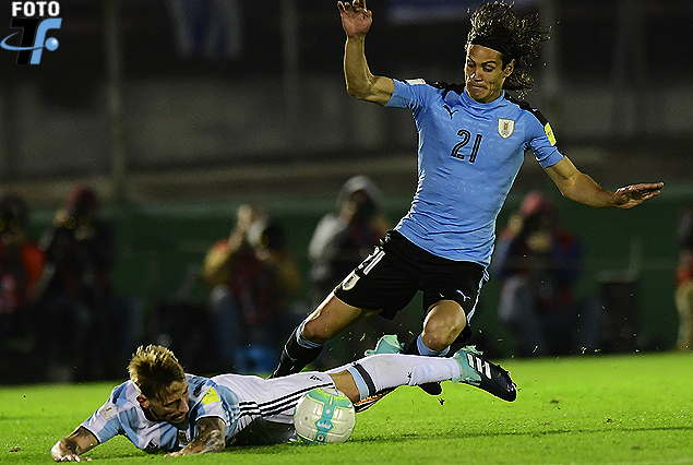Lucas Biglia desde el piso intenta controlar el avance de Edison Cavani.