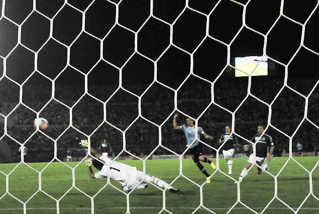 Edinson Cavani ya sacó el remate, la pelota supera el esfuerzo final del arquero argentino Sergio Romero y viaja con destino de red. Tercer gol uruguayo.