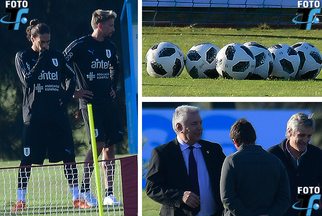 Martín Cáceres y Gastón Ramírez, por primera vez en la cancha, la pelota del mundial que llegó al Complejo y Rafael Peña, el nuevo jefe de seguridad conversando con el Ingeniero agrónomo Salvador Invernizzi.