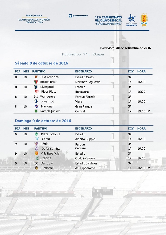 La Mesa Ejecutiva diseñó el proyecto para la séptima fecha del Campeonato Uruguayo Especial que se jugará el fin de semana correspondiente al sábado 8 y doming0 9 de octubre.