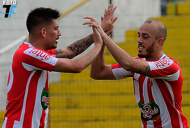 Diego Bértola en el festejo con el autor del gol, Jonathan Souza Motta.
