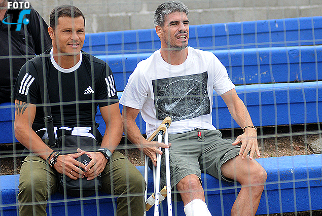 Hugo Souza, incorporado en la semana, y Fabián Yantorno, enyesado en la pierna derecha por la fractura de tibia, siguieron a Sud América en la Tribuna visitante del Parque Artigas de Las Piedras.