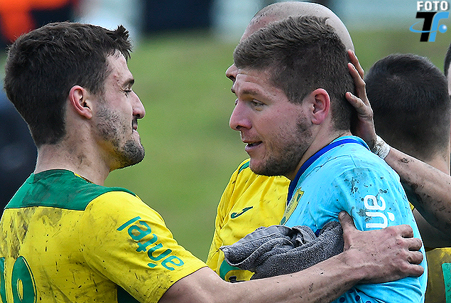 Stefano Perdomo, figura en el arco de Cerrito es felicitado por sus compañeros.