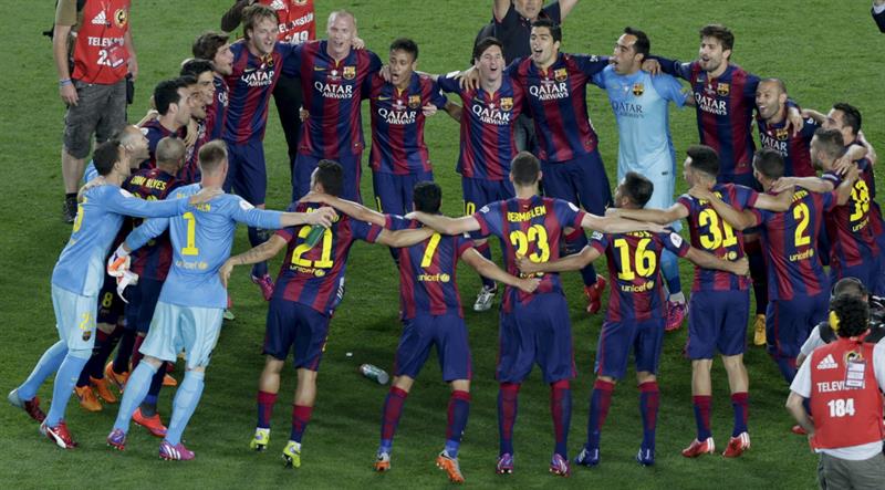 Luis Suárez festejando con sus compañeros de Barcelona la conquista de la Copa del Rey.