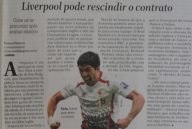 El texto de la nota se ilustra con una foto de Suárez con una camiseta del Ajax donde se le aprecia con un gesto fiero, con la boca abierta y los ojos agresivos, complementándose con sus puños cerrados. El artículo lleva la firma de Vivian Oswald y está remitido desde Londres, donde ese periodista es corresponsal de “O Globo”. Textualmente expresa: “La venganza es un plato que se come frío. Para la selección de Roy Hodgson, que desembarcó de cabeza baja en el aeropuerto de Manchester, donde fui recibida por un puñado de hinchas, la desgracia de su verdugo uruguayos Luis Suárez, tiene gusto a revancha. La mordida de la estrella del Liverpool puede ser el fin de su carrera en ascenso y de sus días en el club inglés. Después de anunciada la sanción de cuatro meses, que afectará también su participación en nueve fechas del Campeonato inglés y tres de la Champion League, el Liverpool prefirió no pronunciarse sobre el caso. El director Ian Ayre se limitó a decir por medio de una nota que el club va a esperar hasta que pueda analizar el relatorio (documento) del Comité de Disciplina de FIFA. Pero, ya hay rumores de que la Directiva podría estar pensando en, finalmente, venderlo para otro equipo. El Real Madrid y el Arsenal habían demostrado interés. En entrevista con la BBC, el Presidente de la Asociación de Hinchas del Liverpool, Richard Pedder, dijo no entender el motivo por el cual fue perjudicado el club con la decisión de la FIFA. Según el, es muy posible que el Liverpool le otorgue una nueva chance a Suárez.