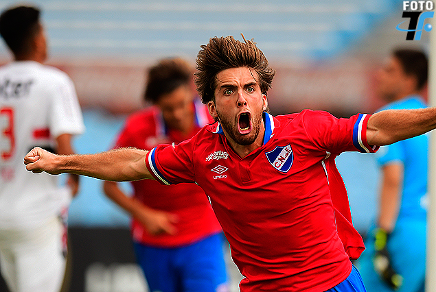 Guillermo May vuela con la boca llena de gol en el festejo del segundo tricolor. Nacional finalista.