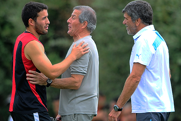 DE SELECCION: Camilo Mayada se saluda con el “Maestro” Tabárez y el Prof. Herrera. Los jugadores titulares de la Franja que juega de noche, presenciaron la práctica matutina en el Complejo de la AUF.