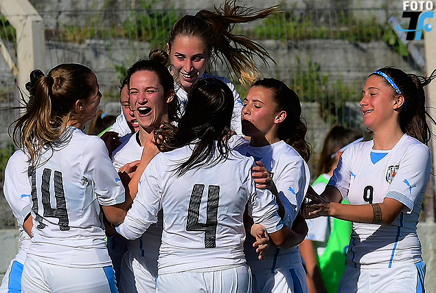 Micaela Fittipaldi, autora del segundo gol, en el centro del festejo de las uruguayas.