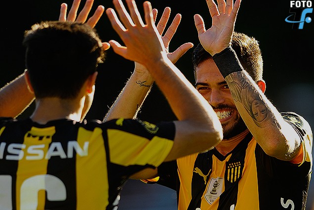 Diego Rossi y Nicolás Albarracín chocan las manos en el festejo del segundo gol aurinegro.
