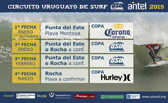 Con la Copa Corona se dará inicio al circuito. La segunda fecha se realizará en enero, pero aún resta definir qué día y si se hará en Playa Montoya o en Rocha. En febrero de 2015 se llevará a cabo la tercera fecha y también se confirmará más adelante, si se hará en Playa Montoya o en Rocha. La última etapa será la Copa Hurley, que cerrará el circuito en el mes de marzo, en alguna playa -a confirmar- de Rocha. “Esperamos tener más etapas, quizá 5 fechas. Lo estamos coordinando y también habrá alguna sorpresa más”, dijo Andrés Umpierres, nuevo presidente de la USU.