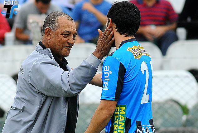 SALUDO: Angelo Gabrielli, lateral derecho de Liverpool, se acercó al banco local para saludar a Juan Tejera, entrenador de Racing. Lo dirigió en Fénix 2014. Reencuentro con afecto en Sayago.