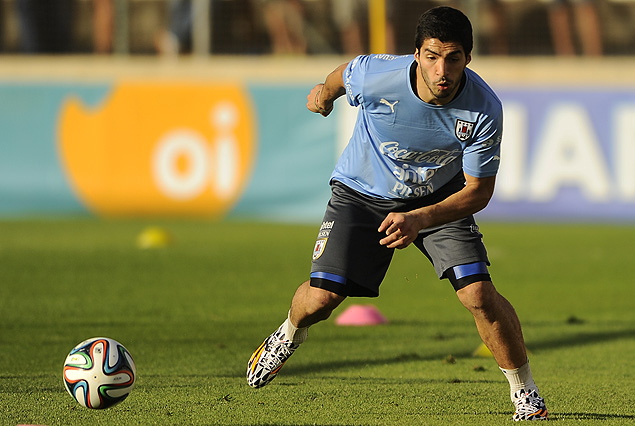 Luis Suárez ya la acarició y corre detrás de la pelota "Brazuca" en la cancha del Estadio Arena do Jacaré.