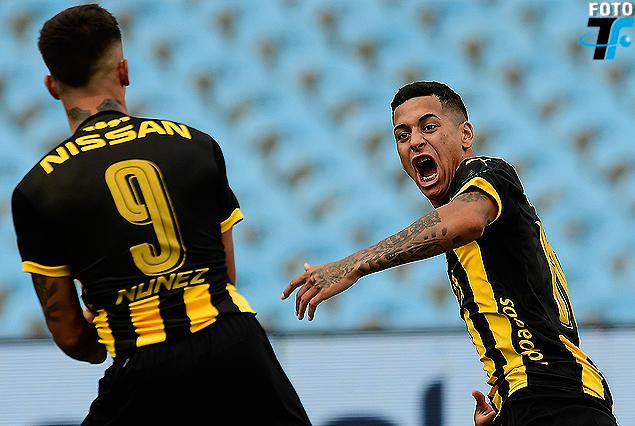 El festejo de Rodrigo Piñeiro en el segundo gol de Peñarol y Brian Rodríguez en la alegría del aurinegro.