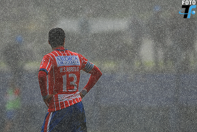 La lluvia en primer plano, empapa a Sebastián Abreu y su clásico número 13.