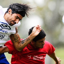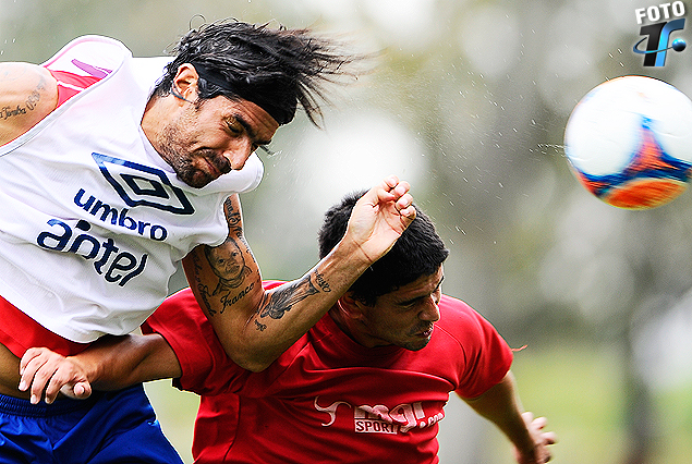 Sebastián Abreu se eleva y logra conectar de cabeza el balón en el amistoso ante Miramar Misiones.