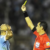 El árbitro paraguayo Arias le muestra la tarjeta amarilla a Maxi Pereira que se toma la cabeza.