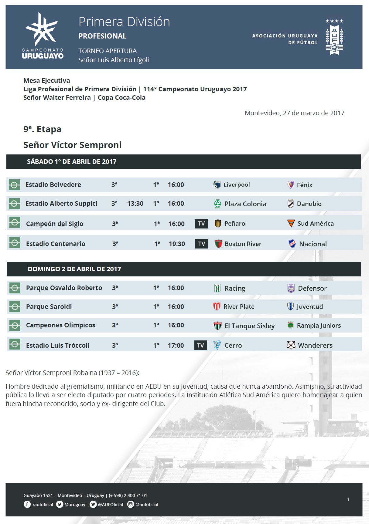 De esta forma, Peñarol – Sud América se adelanta y jugarán el próximo sábado en el Estadio Campeón del Siglo a la hora 16.00. Boston River – Nacional se mantiene tal como estaba fijado y se enfrentarán el mismo sábado a la hora 19.30 en el Estadio Centenario.