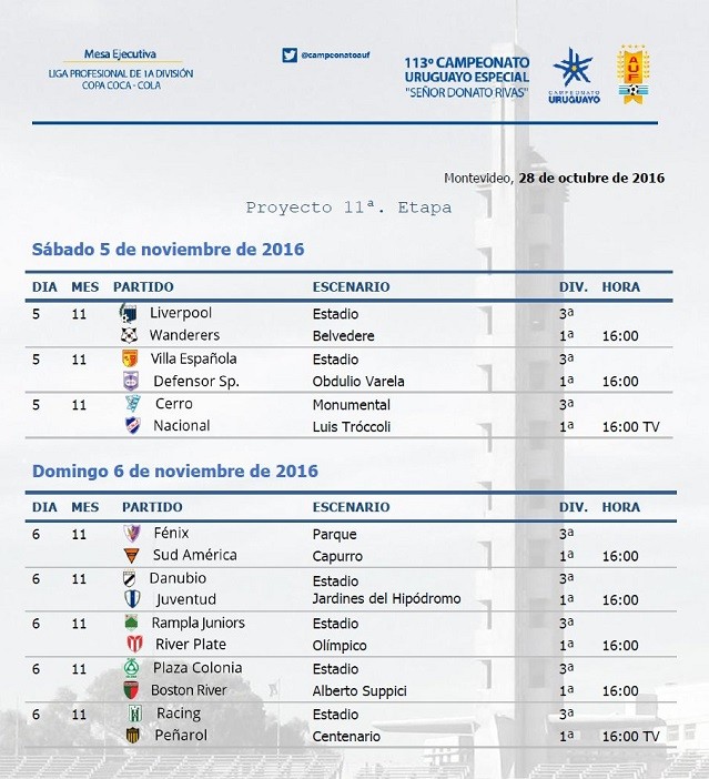Los partidos de los grandes están marcados a la hora 16.00 por diferentes motivos: Cerro – Nacional el sábado 5 de noviembre está programado para el Estadio Luis Tróccoli, escenario que por carecer de red lumínica no puede tener partidos nocturnos. Si tricolores y albicelestes acuerdan jugar en el Estadio Centenario, entonces sí podrán jugar 19.15 y Tenfield elegirá otro encuentro para ser televisado a primera hora de ese sábado.