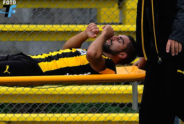 Luis Urruti, visiblemente sentido es retirado en camilla del campo de juego.