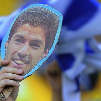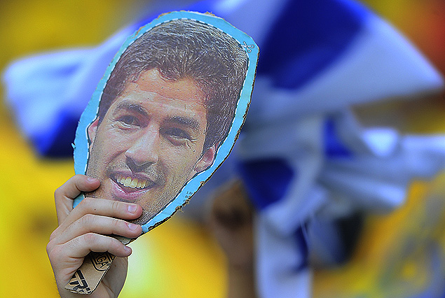 El retrato de Luis Suárez en manos de un hincha uruguayo en las tribunas del Estadio Maracaná.