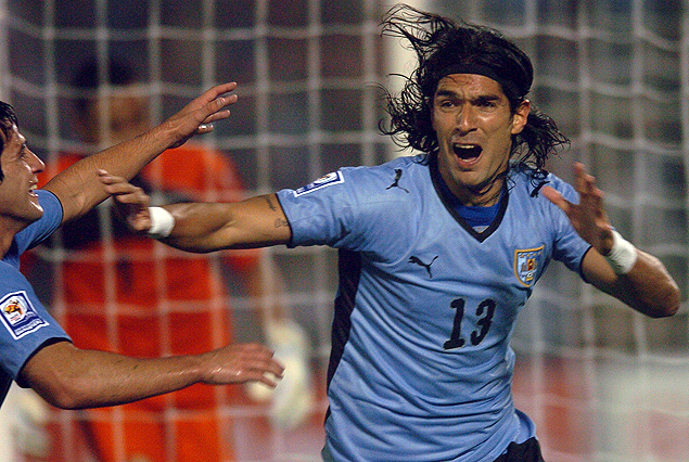 Washington Sebastián Abreu, grita su gol frente a Costa Rica en el Estadio, que permitió asegurar a Uruguay el pasaje a Sudáfrica 2010.