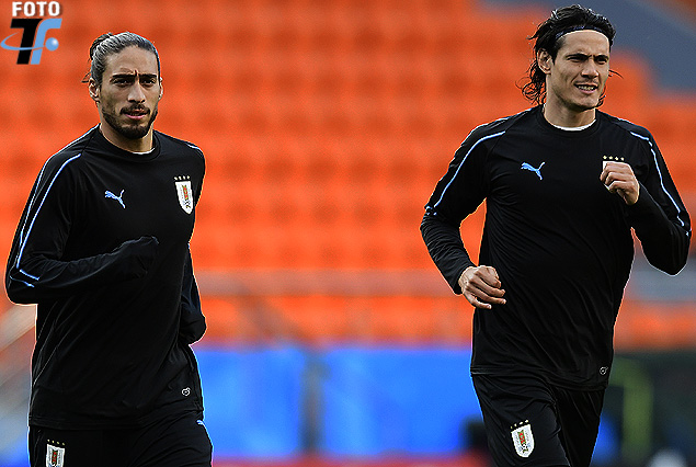 Martín Cáceres y Edinson Cavani en pleno entrenamiento en la cancha del Ekaterimburgo Arena.