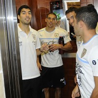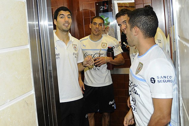 Gran ambiente reina en la selección de Uruguay. Aquí esta fotografía captada hace instantes, cuando los jugadores abandonaban el comedor para dirigirse a sus habitaciones. Sonrientes se observa a Suárez, Maximiliano Pereira, Álvaro González y Gargano.