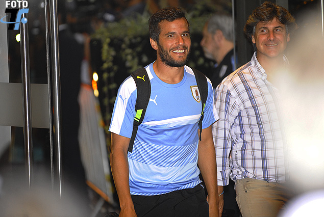 Álvaro González al arribar en la noche del domingo al Hotel Hilton de Lima, sonriente al confirmarse su titularidad en el equipo que jugará ante Perú.