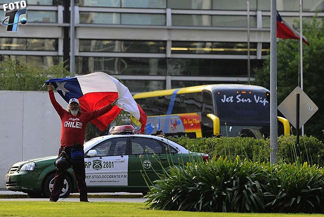 Pero también los aguardaba otro mínimo grupo de chilenos. Los más llamativos eran dos de ellos que portaban una bandera grande de Chile. Se pararon en un lugar estratégico por donde tenía que pasar el ómnibus de la delegación de Uruguay.