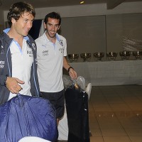 Diego Lugano llegando a la ciudad que lo mantiene como ídolo por su gran trayectoria el club tricolor paulista. A su lado, Diego Godín.