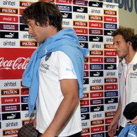 Diego Lugano y Diego Forlán ingresando al vestuario.
