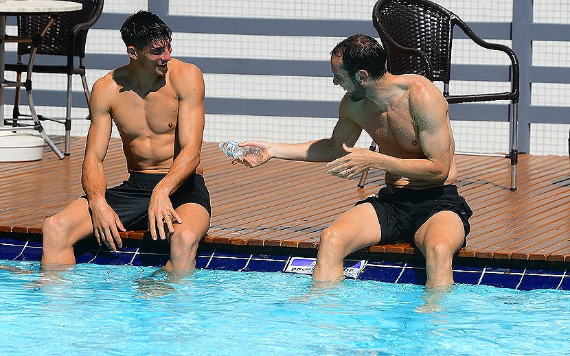 La selección uruguaya, en jornada de relax y de trabajo en el Hotel Deville y en el estadio Dutrinha. Baños en piscina, hisopados y los suplentes se entrenaron en cancha.