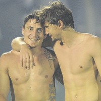 “Cebolla” Rodríguez y Gastón Ramírez, sin camisetas, en el esperado festejo final. Ambos se aprontan para disputar su primer mundial.