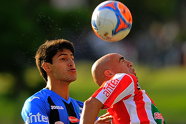 Diego Viñas se arruga para despejar de cabeza, Paulo Pezzolano con los ojos cerrados queda por detrás.