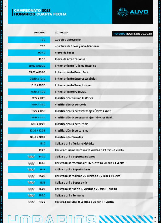 Vuelve Turismo Histórico, llega la 6ta categoría de AUVO a pista Para la disputa de la fecha de los días 7 y 8 de agosto, vuelven a pista las dos categorías de Turismo Histórico, Gran Turismo Histórico y Turismo Histórico Mejorado, los autos históricos de AUVO, de esta manera se suman a la grilla de programación completando las 6 categorías de la Asociación Uruguaya de Volantes para la temporada en curso.