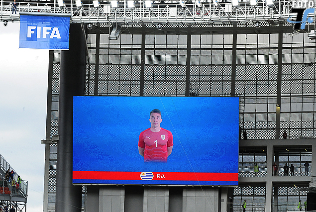 Fernando Muslera con la camiseta roja en la pantalla gigante de la FIFA.