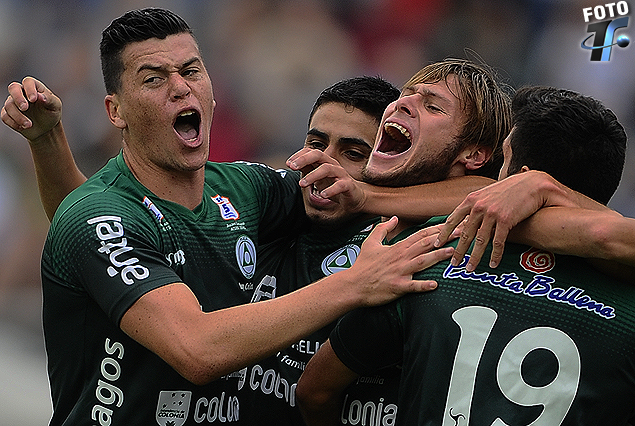 Germán Rivero, el autor del gol, en el centro del festejo de Plaza.