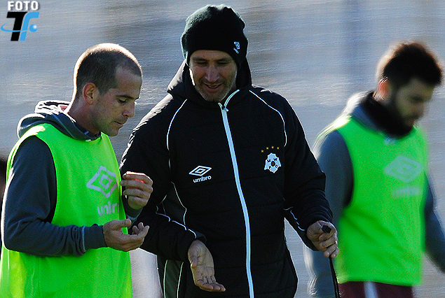 Diego Riolfo escucha las indicaciones de Eduardo Espinel. Atrás aparece Rodrigo Pastorini.