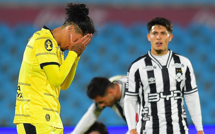 Mauricio Lemos lamenta la derrota de Peñarol, mientras los jugadores bohemios festejan el triunfo.